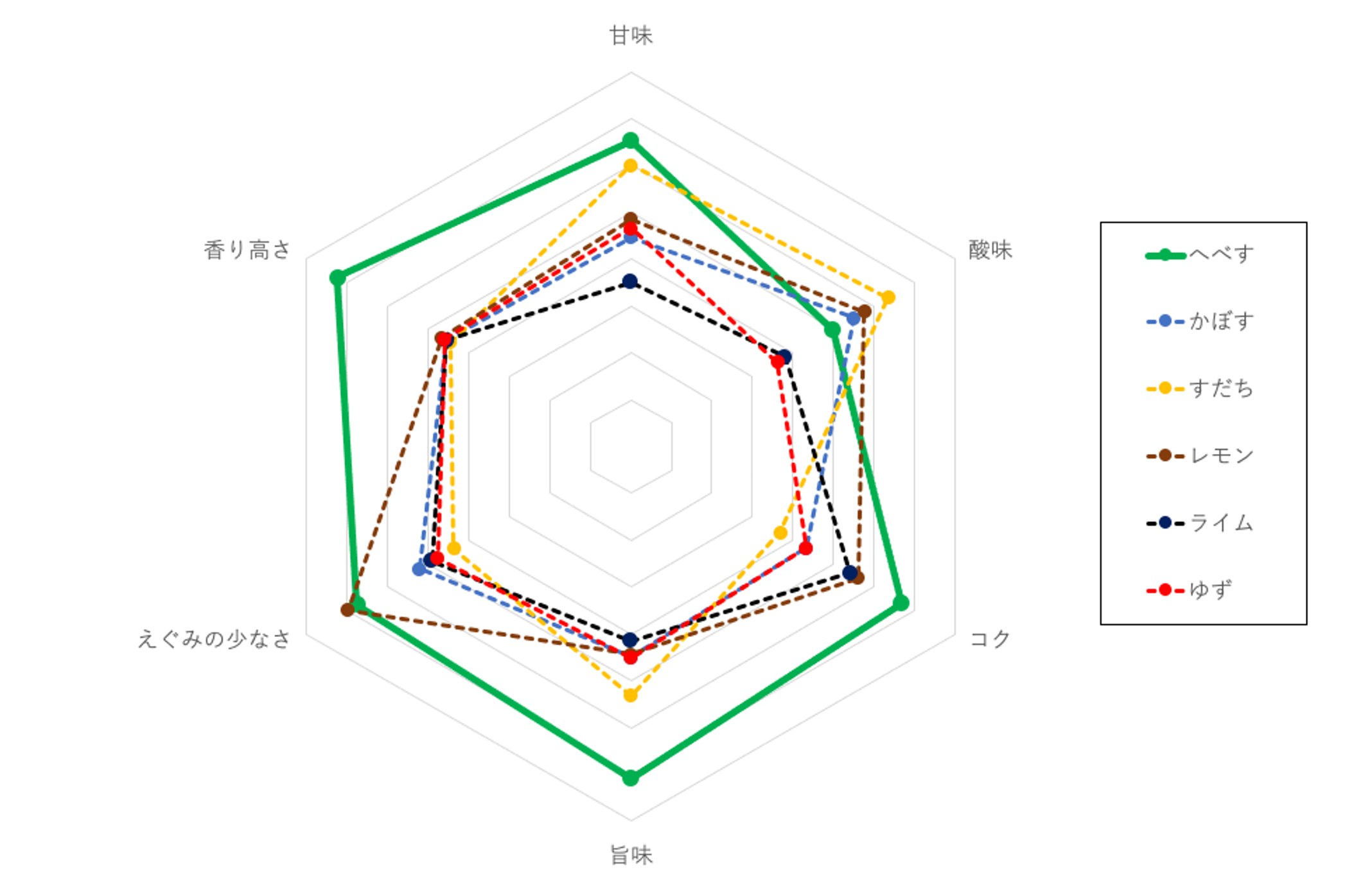 したがって、「ひむか農園のへべす」は、調理用途が近似している柑橘・香橘類である、かぼす、すだち、レモン、ライムおよびゆずと比較して、甘味、コク、旨味、香りを強く味わうことができることが明らかとなりました。