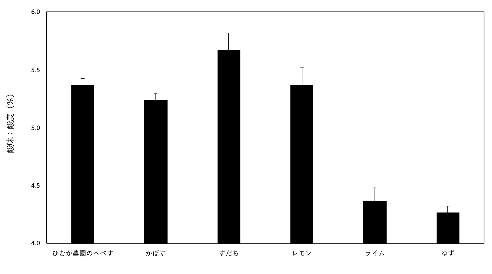 総酸度*3について、「ひむか農園のへべす」は5.37%であり、かぼすの5.23%、すだちの5.67%、レモンの5.37%、ライムの4.37%およびゆずの4.27%と比較して、1.03倍、0.95倍、1.00倍、1.23倍および1.26倍でした(図4)。したがって、「ひむか農園のへべす」の酸味は、かぼす、すだち、レモンと同等で、ライムおよびゆずよりも強いことが明らかになりました。