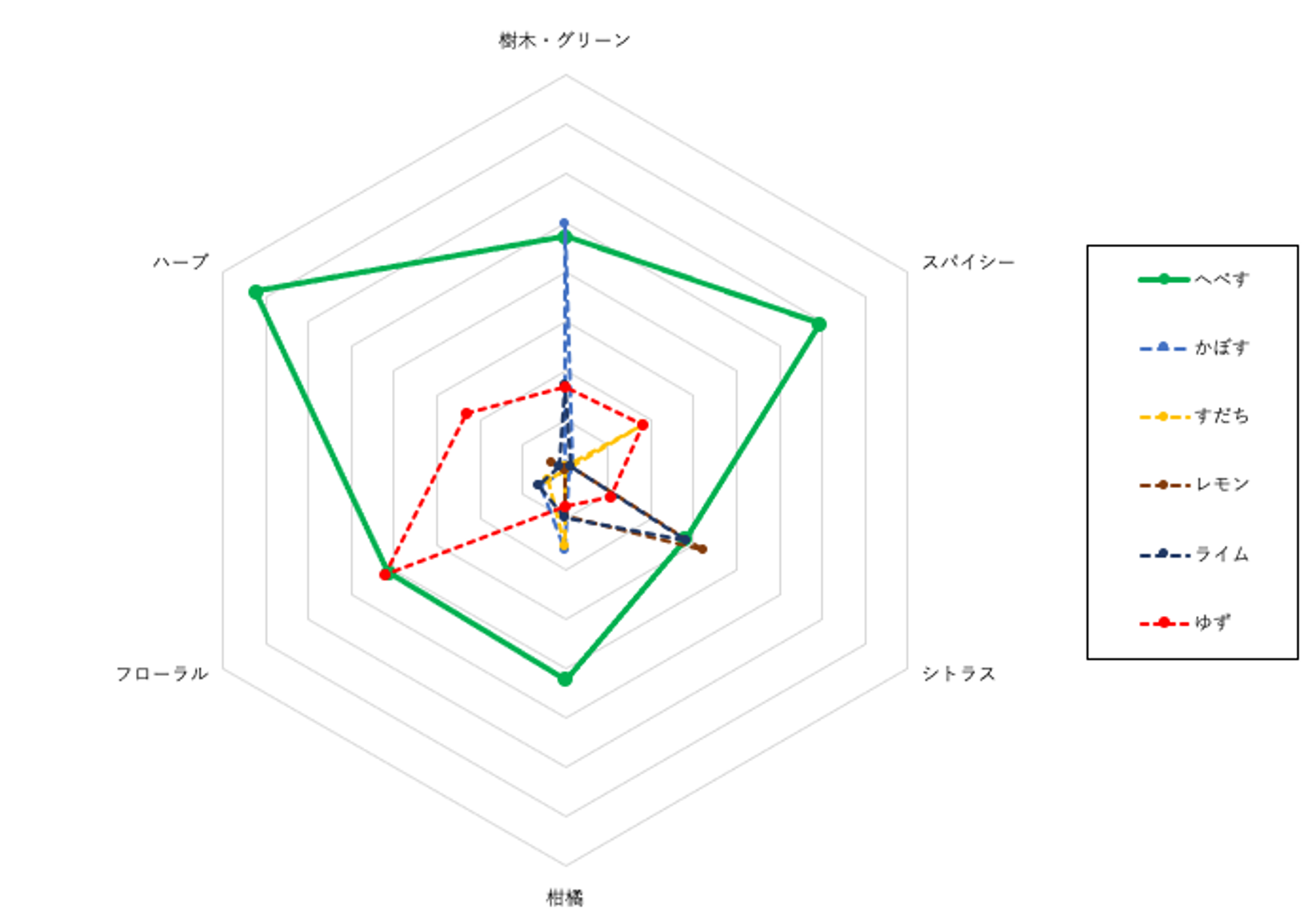 「ひむか農園のへべす」の果皮の香気成分は、かぼす、すだち、レモン、ライムおよびゆずの果皮と比較して、樹木・グリーン香、スパイシー香、柑橘香、ハーブ香が多く含有されており、柑橘香のみならず、その他の香りを感じられることから、複雑で奥深い香りを有することが明らかとなりました(図2)。