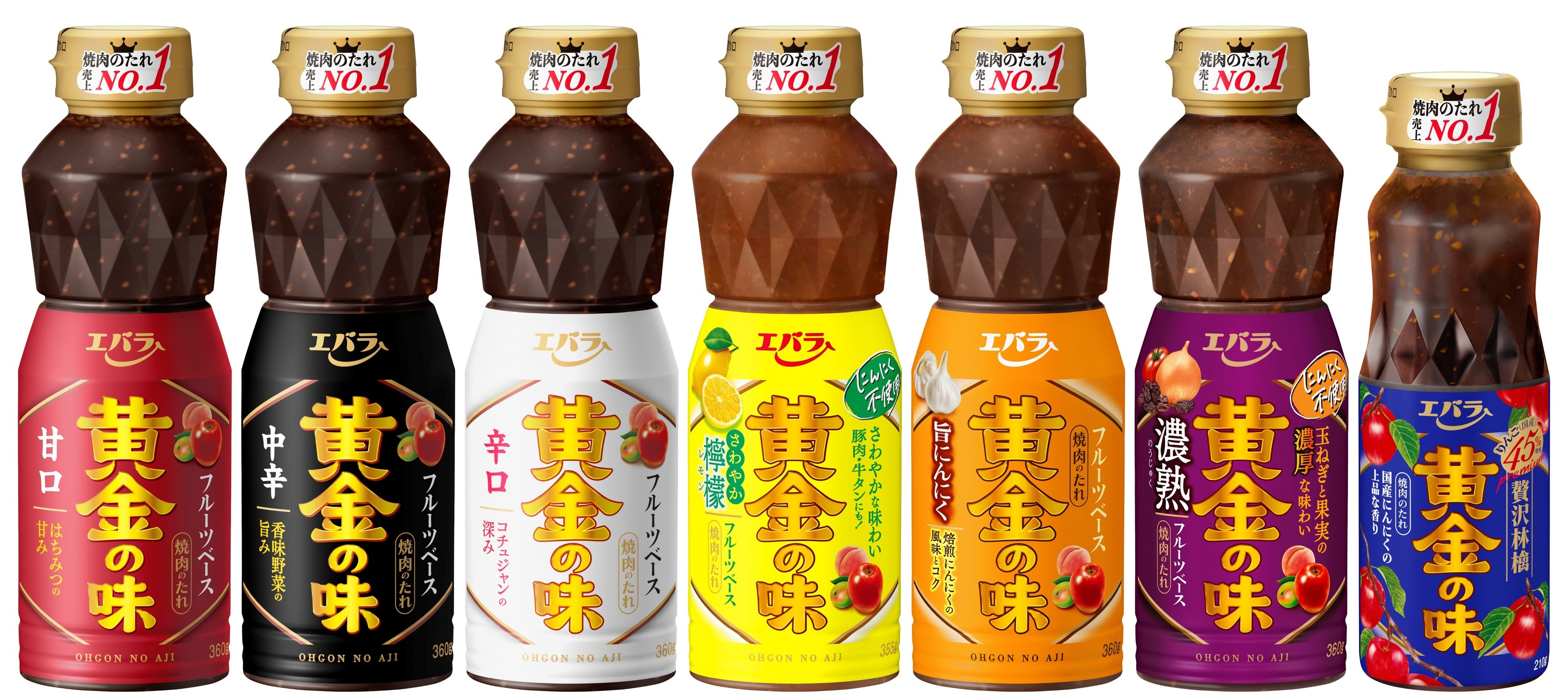 「黄金の味」は、厳選された国産リンゴを原料の3分の1以上に使用したフルーツベースの焼肉のたれです。定番の「甘口」「中辛」「辛口」に加え、「さわやか檸檬」や「旨にんにく」、炒め玉ねぎと果実の濃厚な味わいの「濃熟」、国産リンゴを原料の45%に使用したこだわりのたれ「贅沢林檎」の7種類を展開。好みやシーン、肉の種類に合わせて選べる楽しさを提供しています。