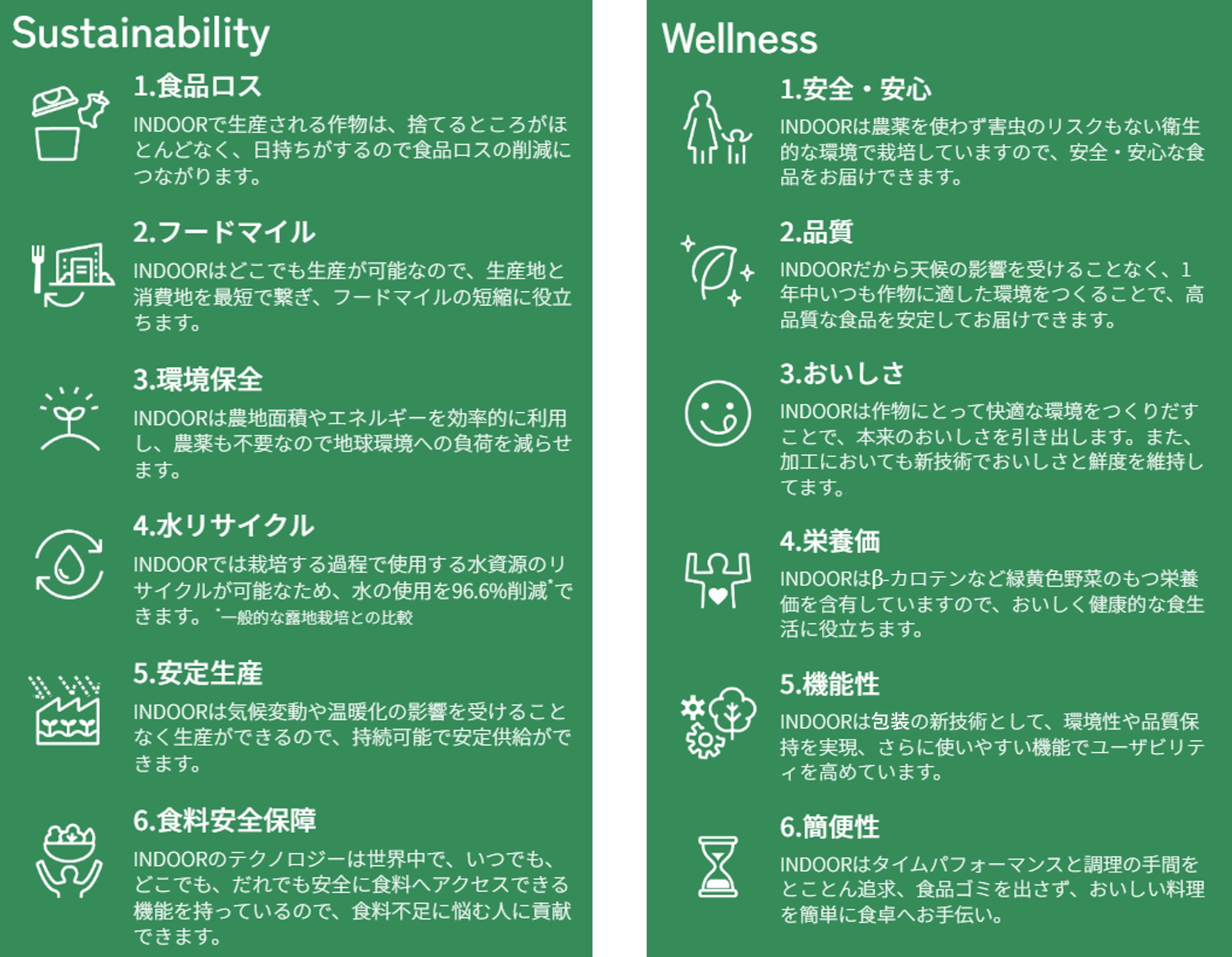 『INDOOR』は、⼈々の⽣活に⽋かせない⼤切な「⾷」について、持続可能性と健康的な暮らしをテーマとした、“未来の⾷づくり”に取り組んでいるブランドです。⼈にやさしく、地球にやさしく、そして作物が元気に育つ、そんな新しい⾷を「屋内=INDOOR」からお届けします。