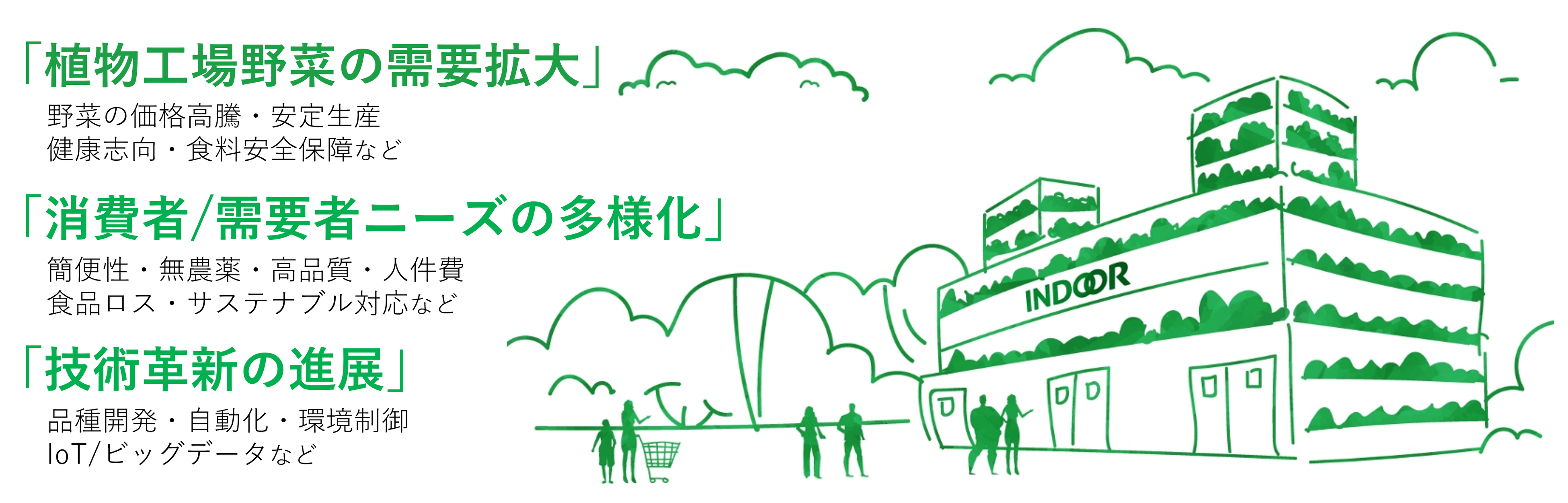 そのような中で、私たちは「イノベーション」と「テクノロジー」で、天候に左右されず、環境への負荷を与えない、持続可能な新しい農業⽣産にチャレンジしています。