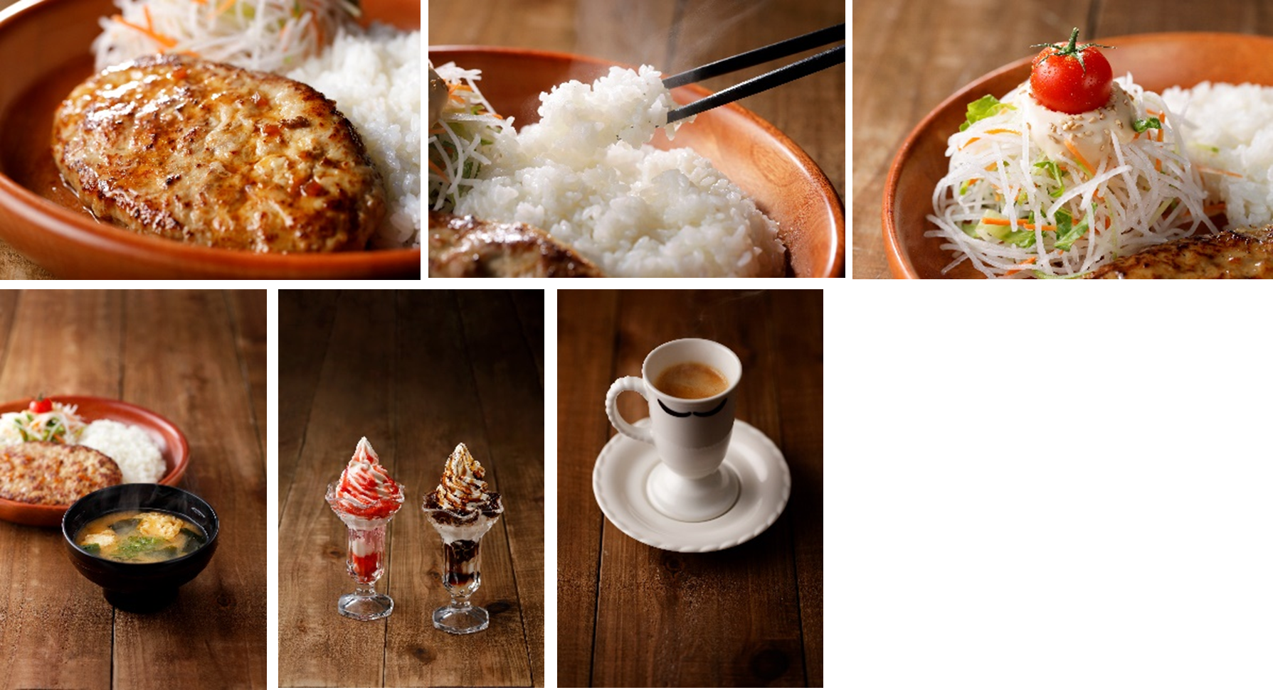焼きたてのハンバーグとよく合うように、あつあつ、つやつや、ふっくらライスを提供します。できるだけ炊きたてを召し上がっていただくために、飲食店としては少ない量を一日に何度も炊いています。農薬の使用を省き、除草剤1回だけで手間をかけて育てたオリジナル米「省農薬米」を使用しています。