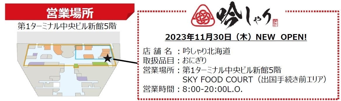 2023年11月30日(木)、第1ターミナル中央ビル新館5階 SKY FOOD COURT内(出国手続き前エリア)に「吟しゃり北海道」がオープンいたします。
