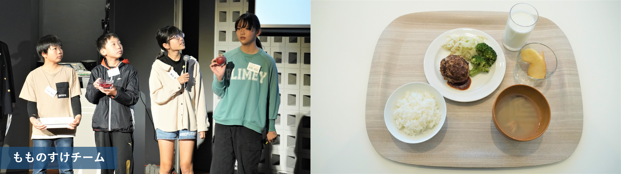 次に、もものすけチームが発表。もものすけは、赤い皮を持つサラダカブであり、普通のカブよりも甘みがあり柔らかいのが特徴で、渡辺農園で有機栽培されています。カブが苦手な人でも食べられるものにしたいという想いで、ハンバーグに混ぜ込みました。園主の渡辺 英征氏は、「私が農園にきた方におススメしていたのは、生で食べることでした。ハンバーグになって、美味しくなっているので、これからはハンバーグで食べることを周囲の皆様におススメしたい」と満面の笑みで喜びを児童たちにメッセージを伝えました。