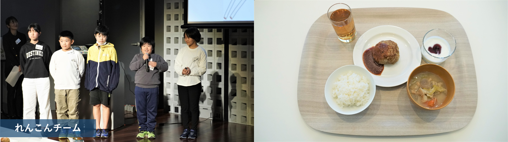 最後に、れんこんチームが発表。毛利 恵美氏(佐伯市地域おこし協力隊・元隊員)が栽培する有機野菜「わたげ蓮根」を、「れんこん入りハンバーグ」と「具だくさんスープ」の2品に使用いたしました。チームの中で一番野菜を多く使用し、その分切る作業が大変でしたが、分担しながら丁寧に仕上げました。「れんこん入りハンバーグ」を試食した毛利氏は、「れんこんのシャキシャキした食感が活かされて感動しました」と語りました。また、「具だくさんスープ」を試食した山口 タカ氏は、「私は普段の食事でスープやみそ汁を必ず飲みます。今回のスープは野菜が豊富で栄養も摂れるなと感じました。本当にあまくて美味しかった」と保護者の皆様にもおススメをしていました。