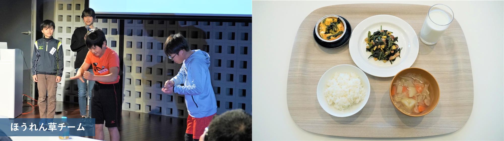 続いて、ほうれん草チームでは、渡辺農園で栽培された有機ほうれん草を主菜と副菜の2品に使用いたしました。主菜は「ベーコン・コーン・ほうれん草のバターソテー」、副菜は「ほうれん草のミニキッシュ」を考案。ミニキッシュでは餃子の皮を生地として使うなど、簡単に作れるメニューを目指しました。久々宮 克也氏(佐伯市教育委員会 教育部長)は、「野菜嫌いの子供にとって、ほうれん草はハードルが高い。ミニキッシュにすると食べやすいので、おやつで食べてもよいかもしれない」と述べられました。