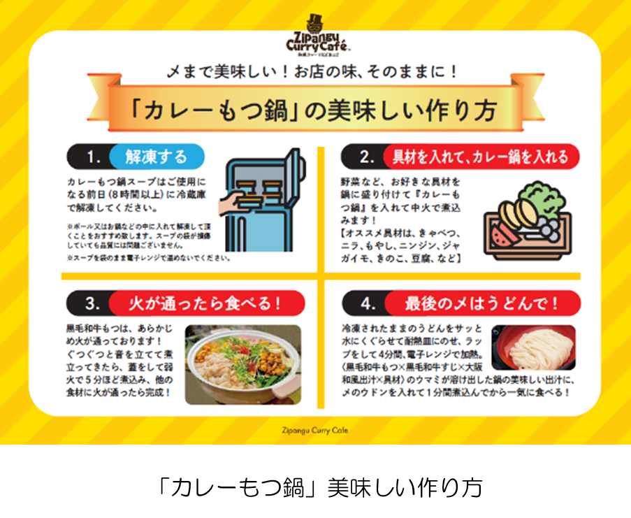 自社が運営する店舗「ジパングカリーカフェ」で、冬の名物となったカレーもつ鍋。食卓で楽しんでいただけるように、瞬間冷凍し、カレーもつ鍋セットとして販売する。家で野菜を入れるだけで、店そのままの味が楽しめる。また、カレーもつ鍋セットには、讃岐うどんのコシと大阪うどんのやわらかさを備えた「大阪讃岐うどん」が付いた贅沢セットになっており、〆まで大阪を楽しんでいただけます。作り方は簡単で、前日の夜に冷蔵庫にて解凍し、お好みの野菜を入れて煮込むだけでお店のカレー鍋が食卓で完成する。家族や、仲間で楽しめる、これからの寒い季節にぴったりな商品です。