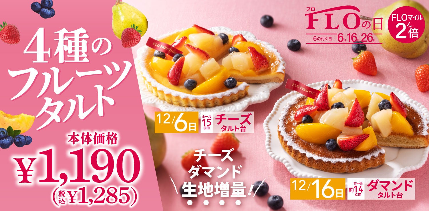 6日はチーズ台、16日はダマンド(アーモンドクリーム)台と、味の異なるタルト台でご用意。さらに、12月の「FLOの日タルト」は、クッキー生地を底に敷き込み、タルト生地(チーズやアーモンドのアパレイユ)を型の淵まで流し込んで焼き上げた、“淵までタルト生地たっぷり仕込み”で仕上げているため、どちらのタルトも従来とは一味違う、“新食感”をお楽しみいただけます。タルトに合うよう味も量もバランス良く盛り付けられた4種のフルーツと、各タルト生地との組み合わせによって織り成す、新たな食感と風味をぜひご賞味くださいませ。