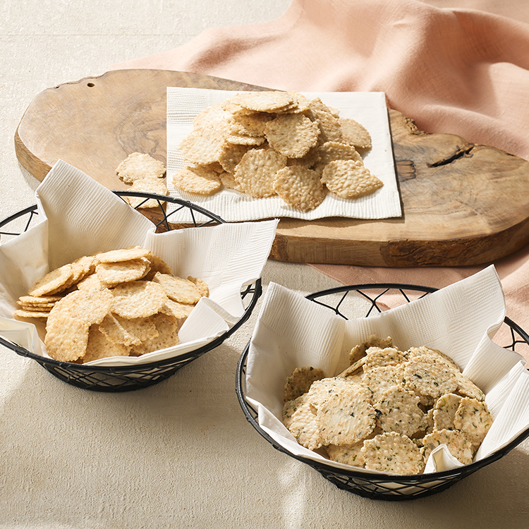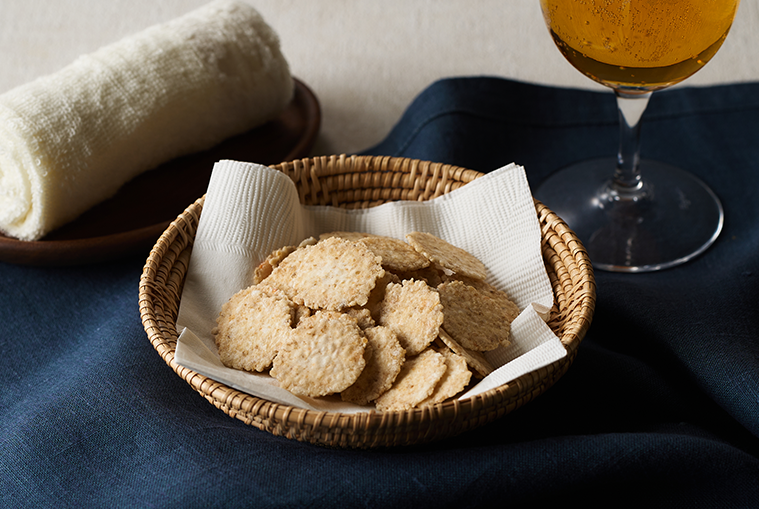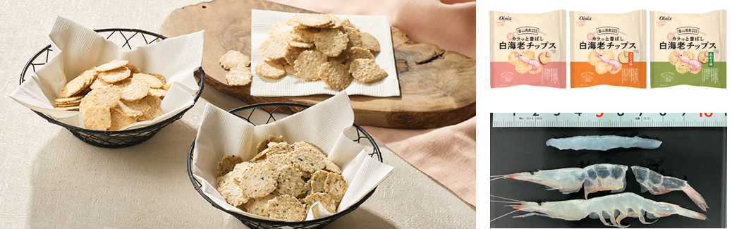 この旨味たっぷりの白海老の殻をミンチ状にして、生のまま国産の馬鈴薯に混ぜ込みチップスにすることで、白海老のおいしさや旨味、香ばしさをダイレクトに感じていただけます。噛み応えのある、少し固めの食感に仕上げるために、焼き上げの工程で、水分量や焼き時間、温度の調整にもこだわりました。