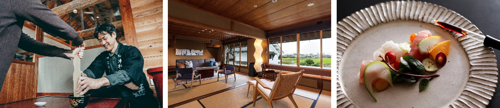 レストラン「蔵元料理マルト醤油」では、ご自身で絞ったできたての醤油を味わうことができる、和モダンなコース料理をご提供。農薬や化学肥料を使わず自家栽培した大和伝統野菜をはじめとする約150種類の野菜を使用した持続可能なガストロノミーが評価され、ミシュラングリーンスターを2年連続で受賞しています。