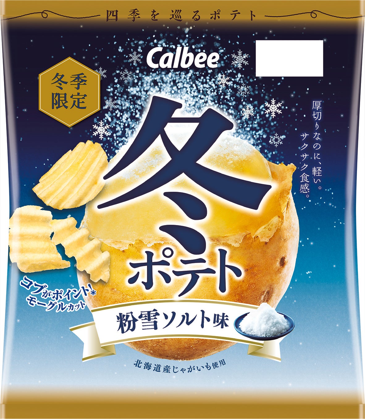 「冬ポテト」は、北海道産ジャガイモを使い、厚切りなのに軽い食感が楽しめる冬限定のポテトチップスです。「ア・ラ・ポテト(秋)」・「夏ポテト」・「春ぽてと」に続く、四季を巡るポテトシリーズとして2019年に初登場。その後は毎年冬限定のポテトチップスとして発売しております。冬に適したポテトチップスを目指し、行き着いたカット「モーグルカット」が特長です。モーグルはコブを意味しており、大きな凹凸のコブができるようにカットすることで、厚切りなのに軽い、独特のサクサク食感を実現しました。さらに、日本音響研究所の調査で、「冬ポテト」を食べた時の音が“新雪を踏む音”に似ていることがわかるなど、まさに寒い季節にぴったりの商品です。