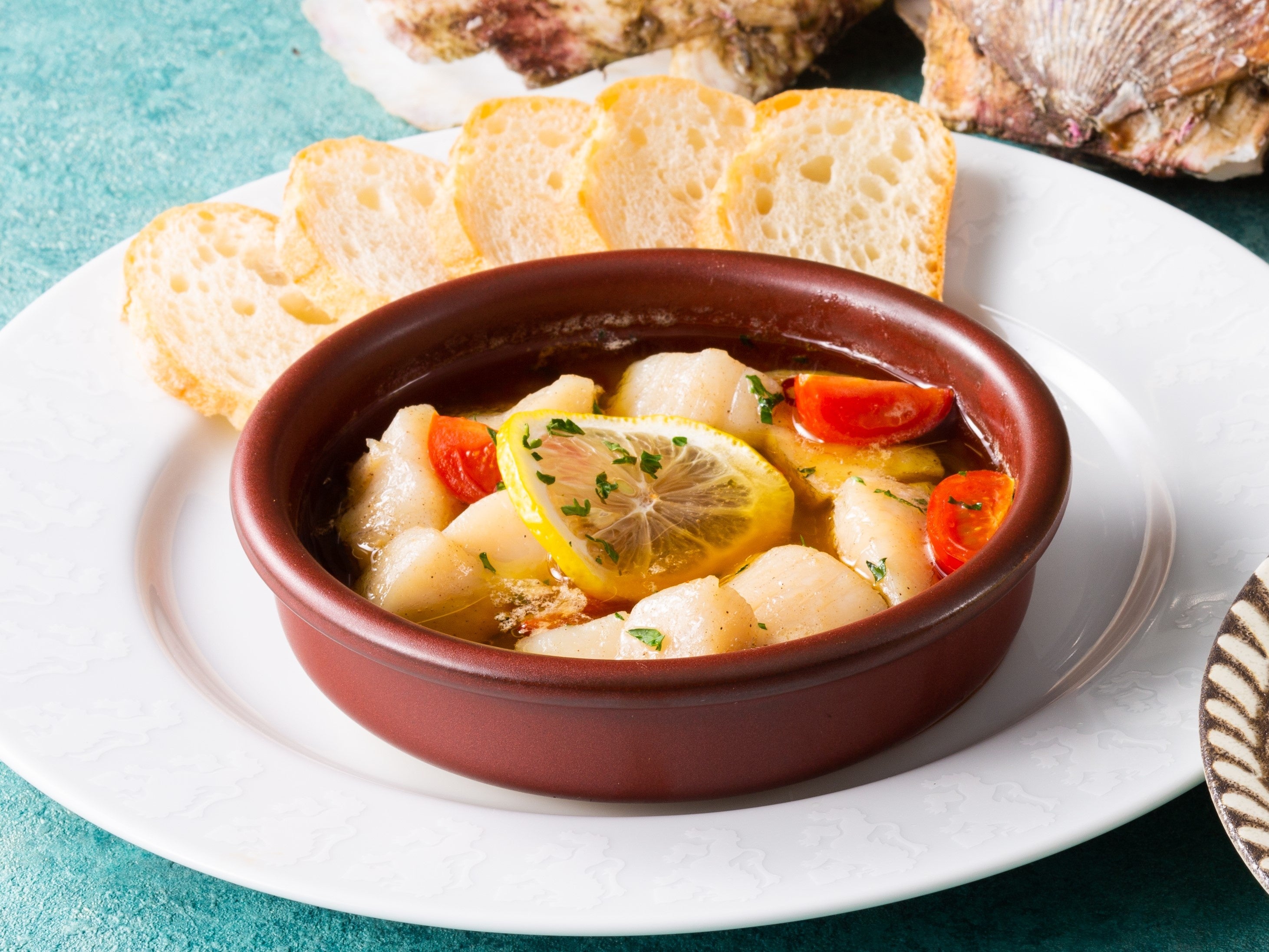 ジャンボ帆立を歯ごたえが楽しめるサイズにカットして熱々のアヒージョにしました。