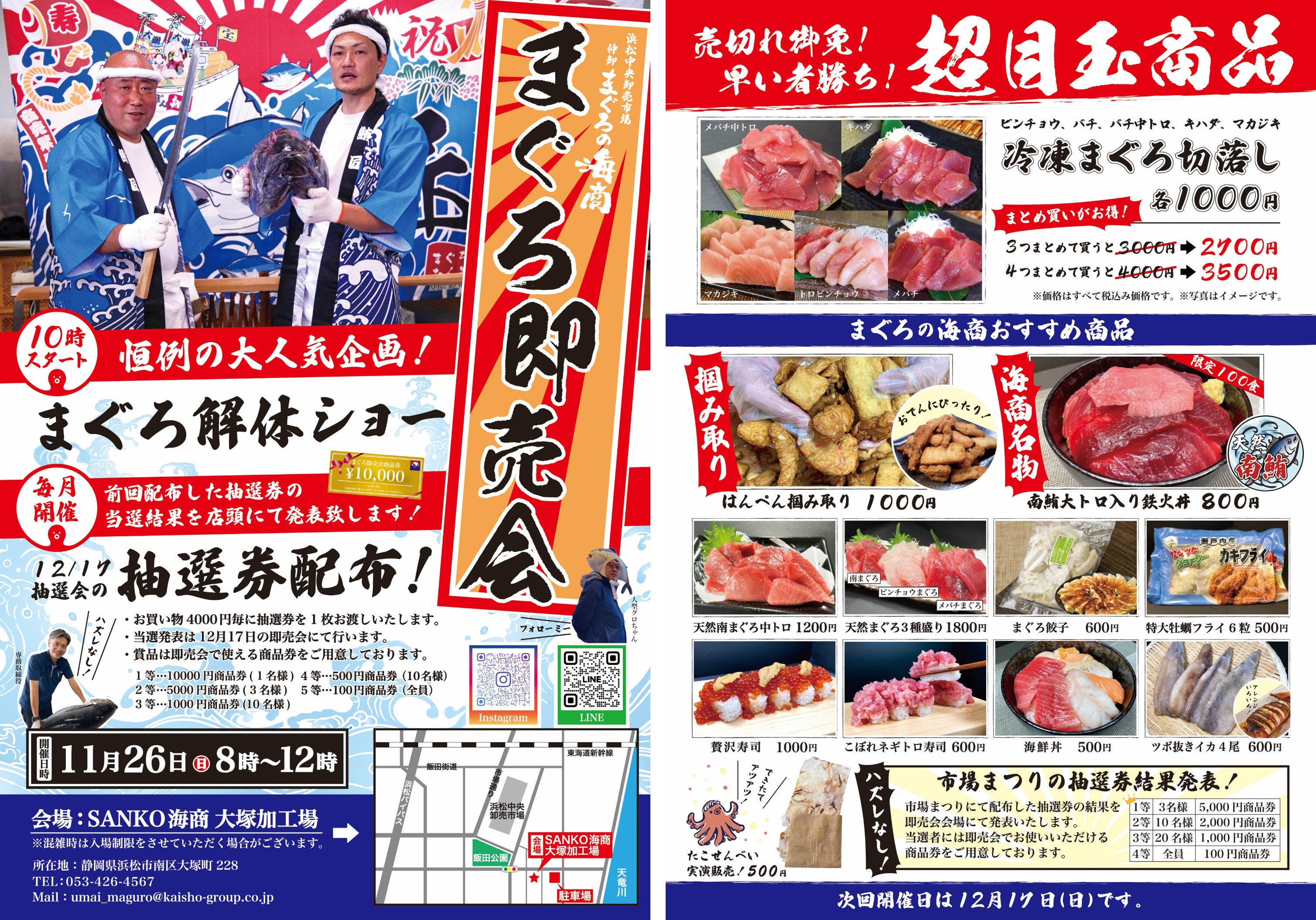 グループ会社である浜松市中央卸売市場のまぐろに特化した仲卸「SANKO海商」も、市場外流通の増加に危機感をもち、一般のお客様へ『まぐろ即売会』を毎月開催しております。