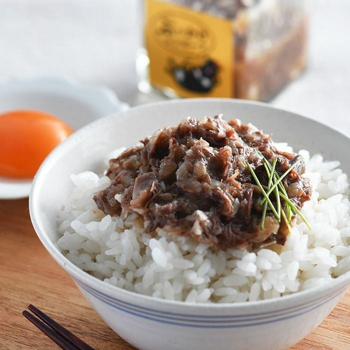 一般的に用いられる肩肉やモモ肉ではなく、使うのはコクと甘みの強い牛テール。黒毛和牛牝のみを扱う焼肉店が作る、ひと味違うコンビーフだ。テール肉の深い旨みを引き立てるのは、白浜海岸の海水から手作りした天然塩の優しい塩気。ニンニクやゴマ油の香りも見事なハマりっぷりで、白飯をかき込みたくなる。