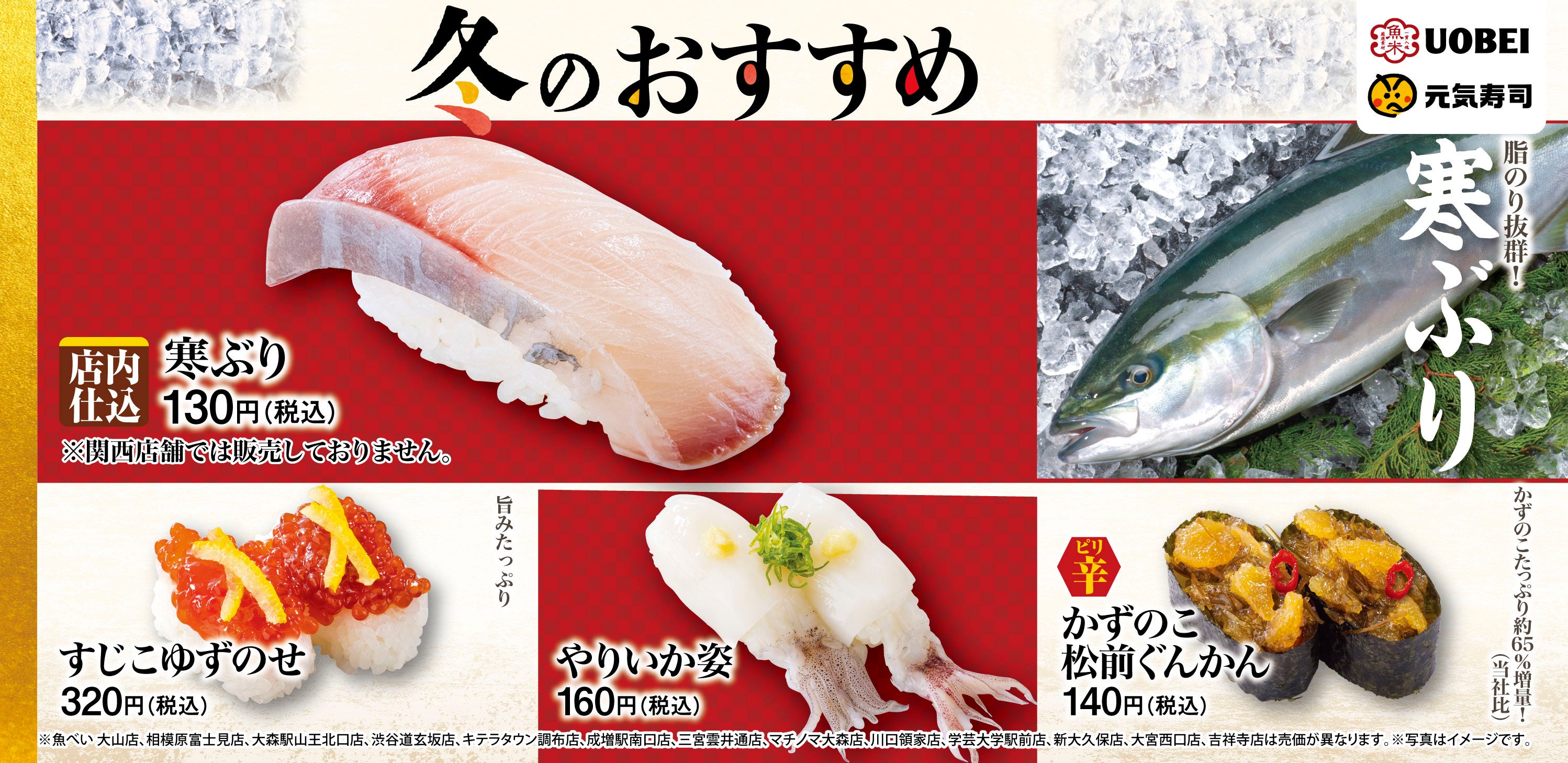 また、脂乗り抜群な“寒ぶり”をはじめとした、この冬旬の食材を取り揃えた「冬のおすすめ」商品も多数ご用意しています。この機会に、是非魚べい・元気寿司で旬なネタの数々をご賞味ください。