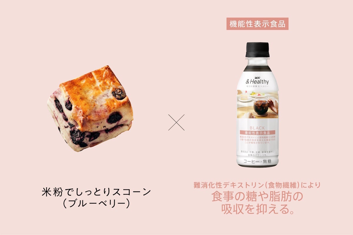 苦味・酸味が少なく、すっきり飲みやすい味わいの『UCC &Healthy BLACK PET270ml』には、国産の米粉を使用し、ブルーベリーのほのかな甘さと、しっとりとした食感が特徴的な「米粉でしっとりスコーン(ブルーベリー)」。ほどよい酸味をもったブルーベリーがコーヒーの風味を引き立て、すっきりとした味わいのコーヒーに、ほのかな甘みが加わることで、バランスの良い調和を体験いただけます。