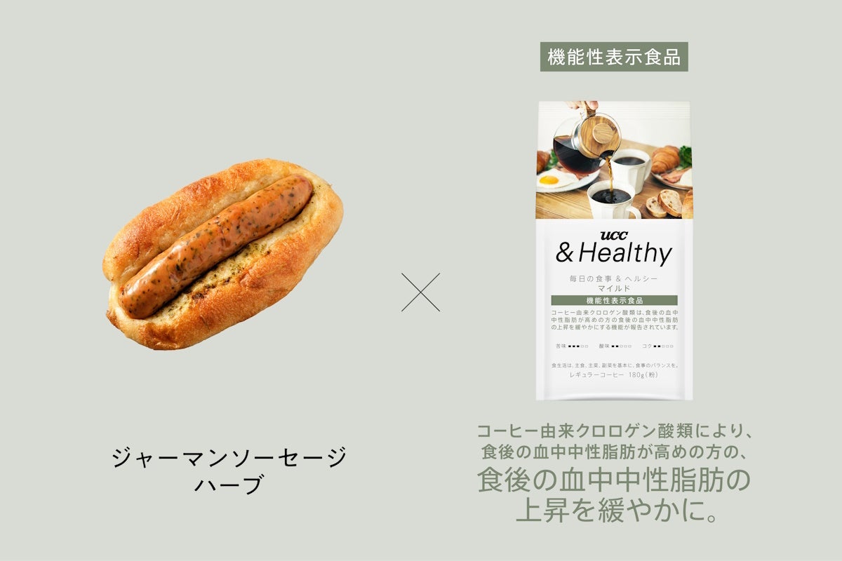 ハーバルな香り・味わいが特徴の『UCC &Healthy マイルド SAP180g』には、ソーセージに多くのハーブを使用し、パン自体にもローズマリーを練り込みバジルソースで味付けをした総菜パン「ジャーマンソーセージ ハーブ」。ハーブ系の食材と合わさることで、お互いのハーバルな風味が引き立ち、バランスの良い味わいをお楽しみいただけます。