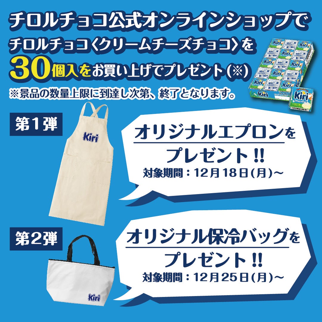 チロルチョコ公式オンラインショップ(https://shop.tirol-choco.com/)で、チロルチョコ<クリームチーズチョコ>を30個以上お買い上げの⽅に「キリ」オリジナルグッズをプレゼント︕