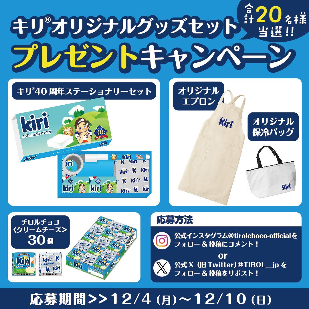 抽選で合計20様に「キリ」40周年ステーショナリーセット、「キリ」オリジナルエプロンとオリジナル保冷バッグ、「チロルチョコ〈クリームチーズチョコ〉」をプレゼントします。