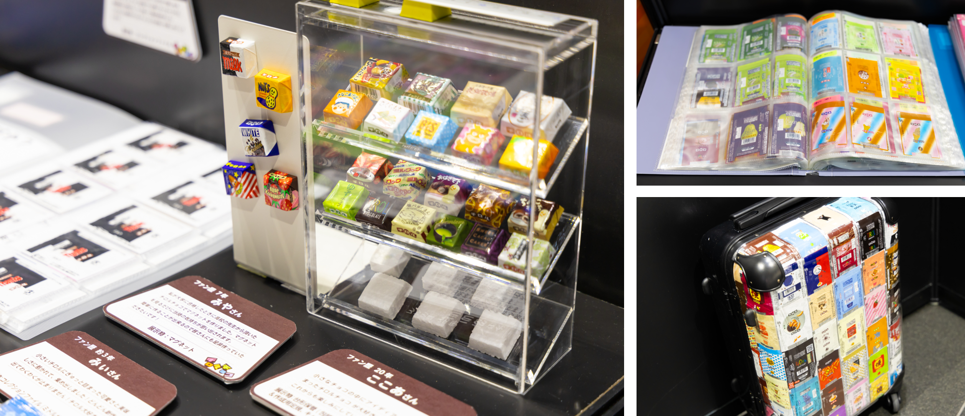 チロルチョコの 大ファンである“チロリスト(TIROLIST)”達が集めた包装紙のコレクションファイルやオリジナル作品をお借りし、展示しました。マグネットや発泡スチロールに包装紙を巻きつけて保管している方や、包装紙をアレンジして作った世界に一つのオリジナルキャリーケースを作っている方も!