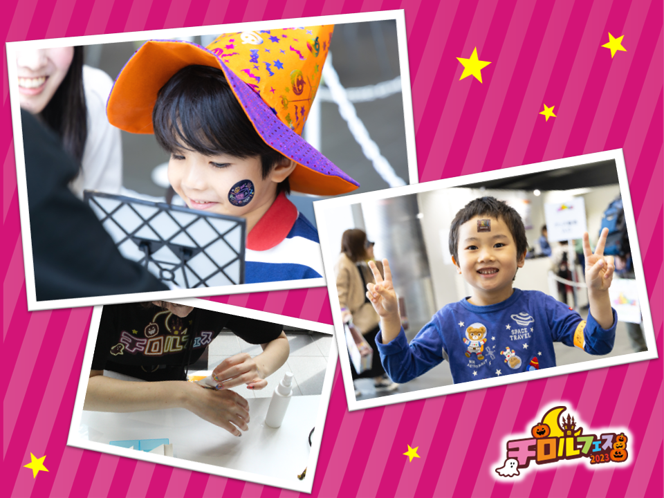 かわいいフェイスシールを顔や手に貼ってイベントを楽しむ方がたくさん!サイコロの出る目を予想して当たった方には、追加でもう1枚シールがもらえるWチャンスも♪