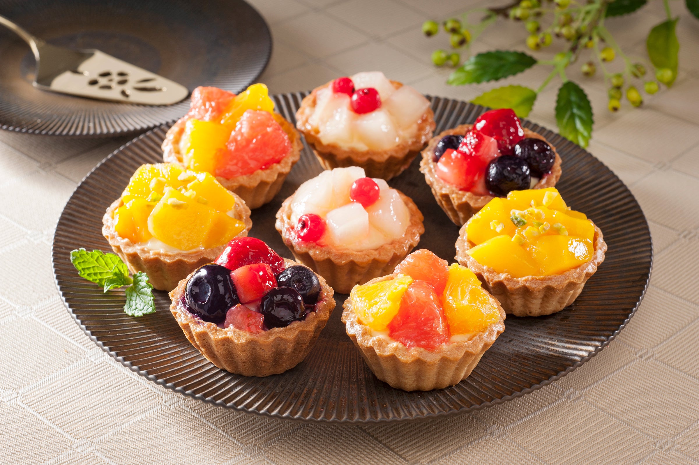 フルーツを彩りよく盛り付けした果実感あふれるミニサイズのタルト。ジューシーなフルーツになめらかなクリーム、ホロッとした食感のタルトがお口いっぱいに広がります。