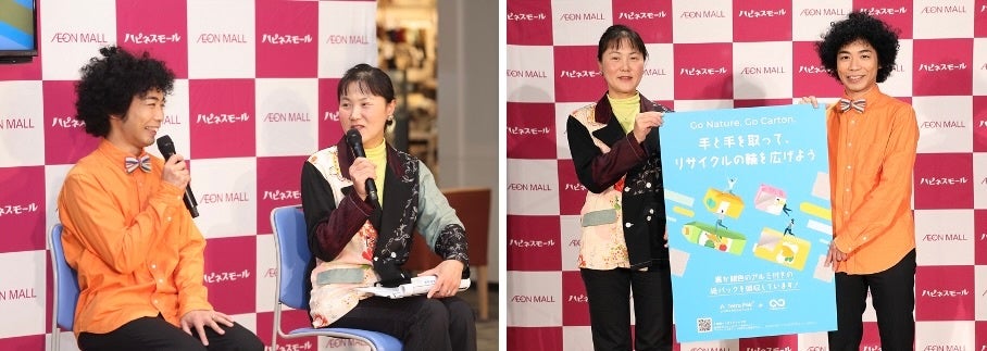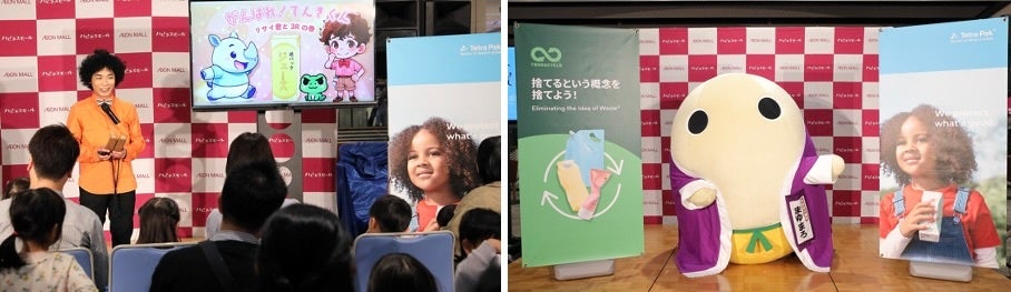 日本テトラパック代表取締役社長 アレハンドロ・カバル、イオンリテール近畿カンパニー支社長 川本昌彦氏、テラサイクルジャパン代表 エリック・カワバタ氏に加えて、本取り組みをサポート頂いている京都府副知事 山下晃正氏にもご登壇いただき、イオンの一部店舗におけるアルミ付き紙パック回収のスタートを宣言。京都府公認キャラクターまゆまろと一緒に、スペシャルゲストとして、気象予報士、防災士で紙芝居師でもあるくぼてんき氏によるパフォーマンスや、総合地球環境学研究所 教授の淺利美鈴氏をお招きしたトークショーも行いました。