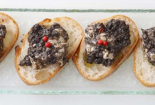 ブラックオリーブとアンチョビ、ガーリックのペーストにボイルした牡蠣を加えました。白ワインに合います。