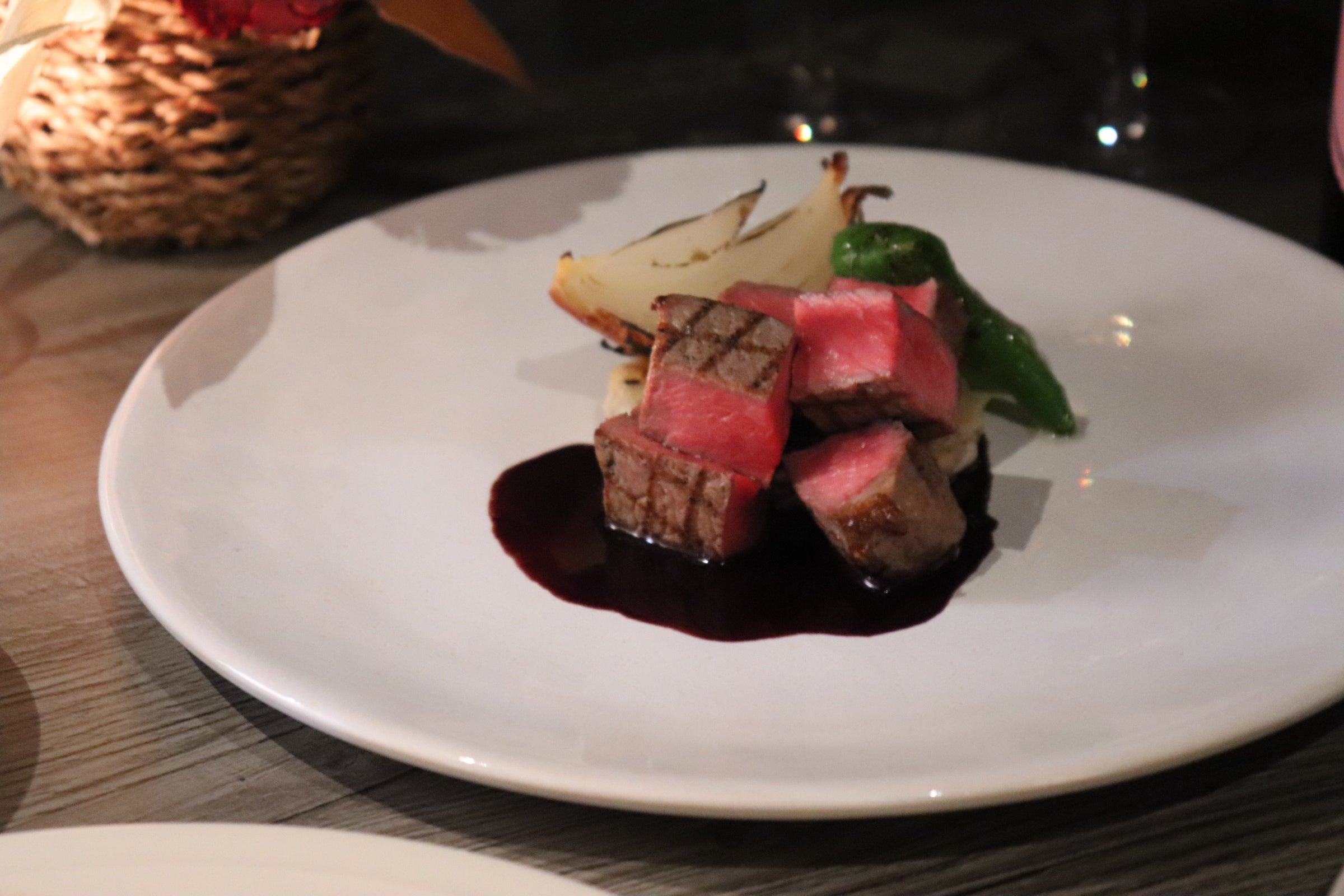 ♦メイン ロンググレインロースステーキ 海老芋のガレットと玉ねぎのロースト 赤ワインソース