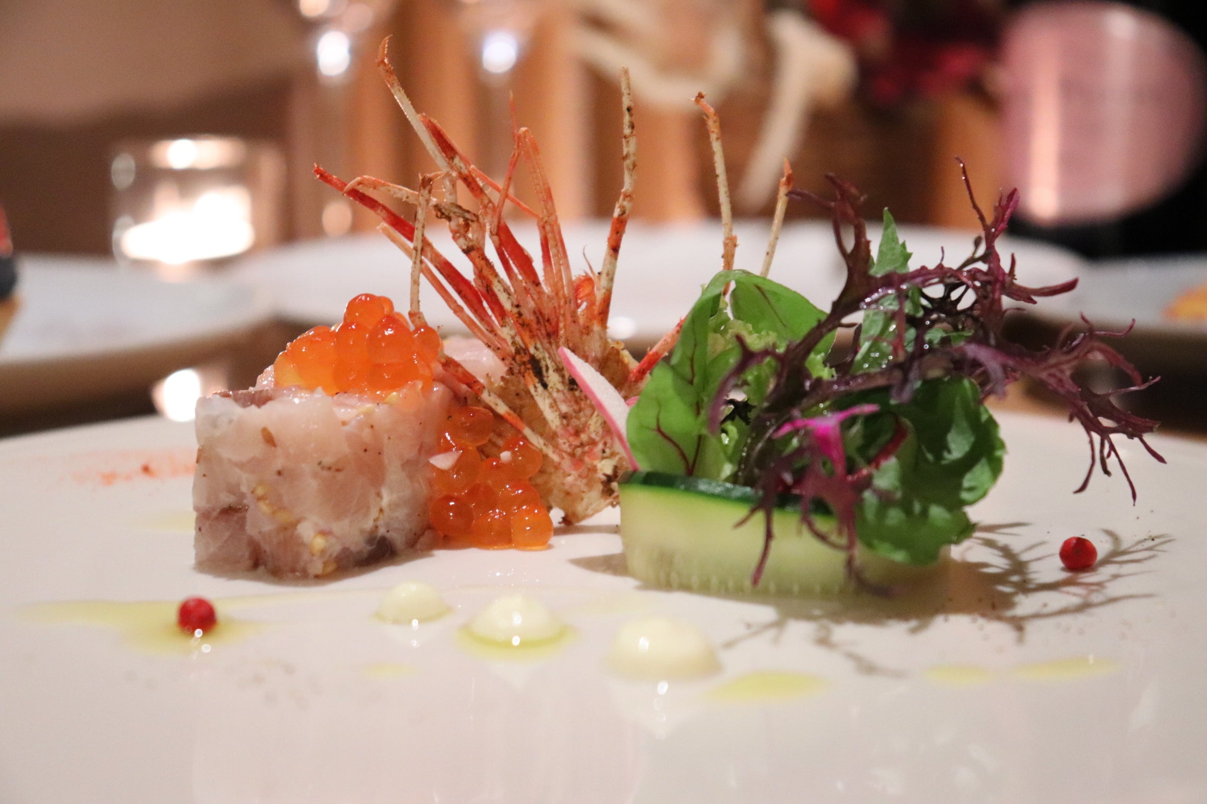 ♦前菜 寒ブリとボタン海老のタルタル いくら添え 山葵と豆腐のソース