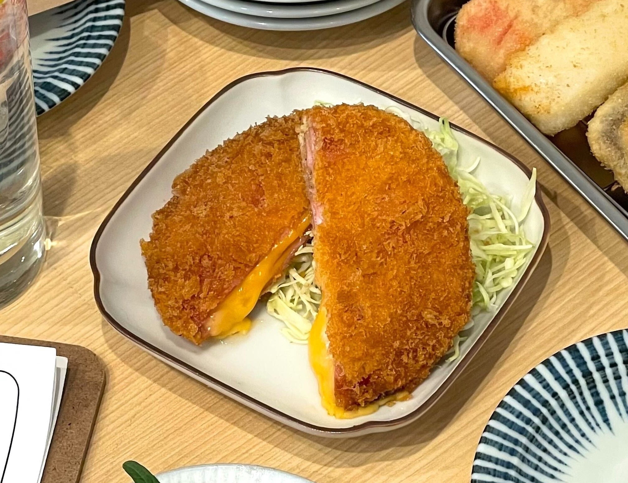 スライスハムに熱々とろとろの濃厚なチェダーチーズを挟んだ ハムカツです。