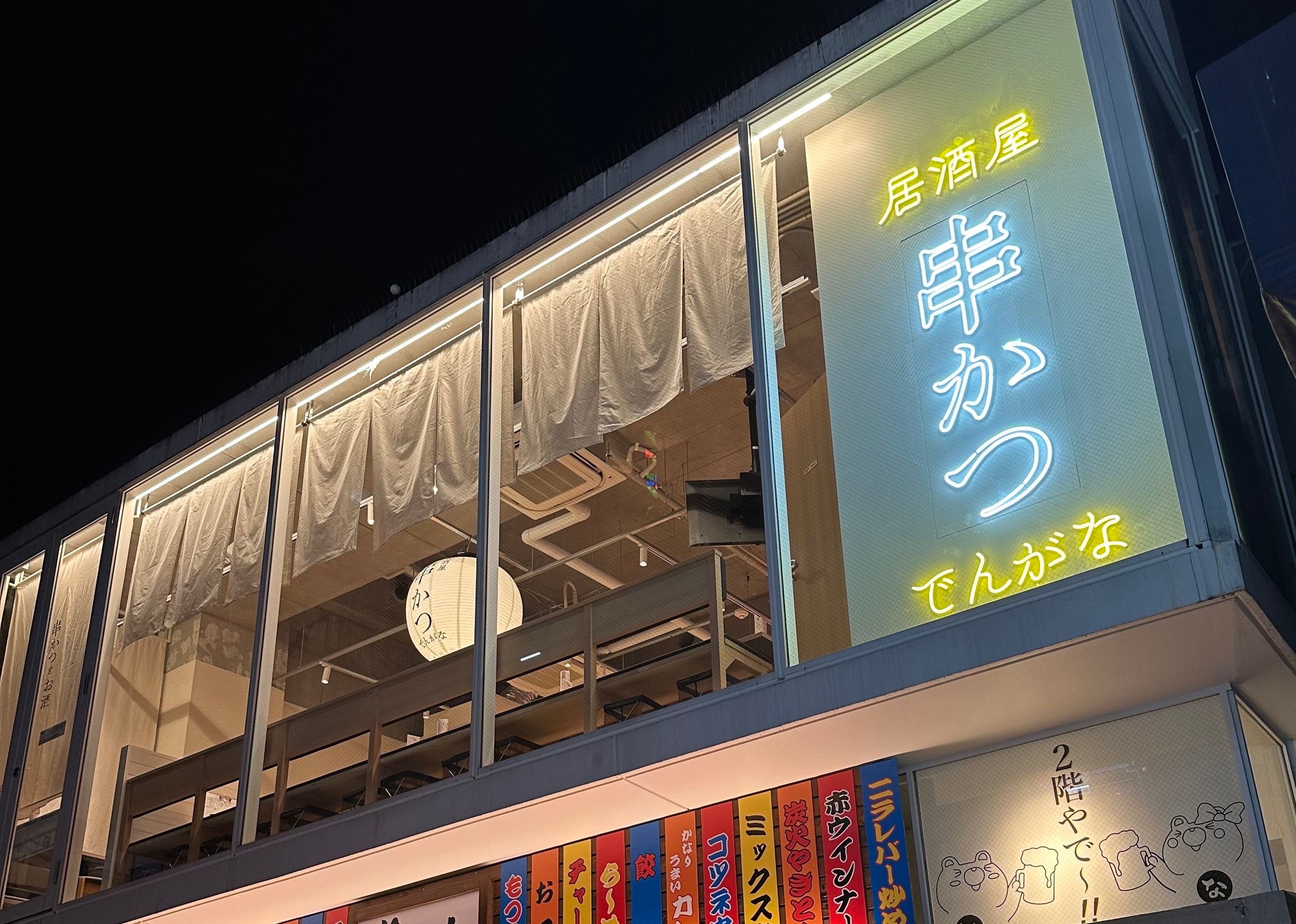 このネオ居酒屋をより多くのお客様にお楽しみいただけるよう、「串かつとお酒 でんがな」の8店舗目を吉祥寺に新たにオープンします。大きなのれんと提灯が目印です!
