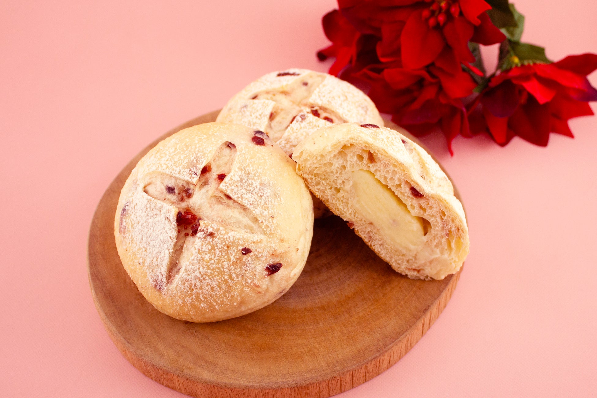 価格:持ち帰り 173円(税込)・店内飲食 176円(税込)ドライクランベリーを練り込み、オセアニア産クリームチーズを使用したチーズクリームを包み焼き上げました。白いふわふわな生地に甘酸っぱいクランベリーとクリームチーズの味がクセになる優しいパンです。