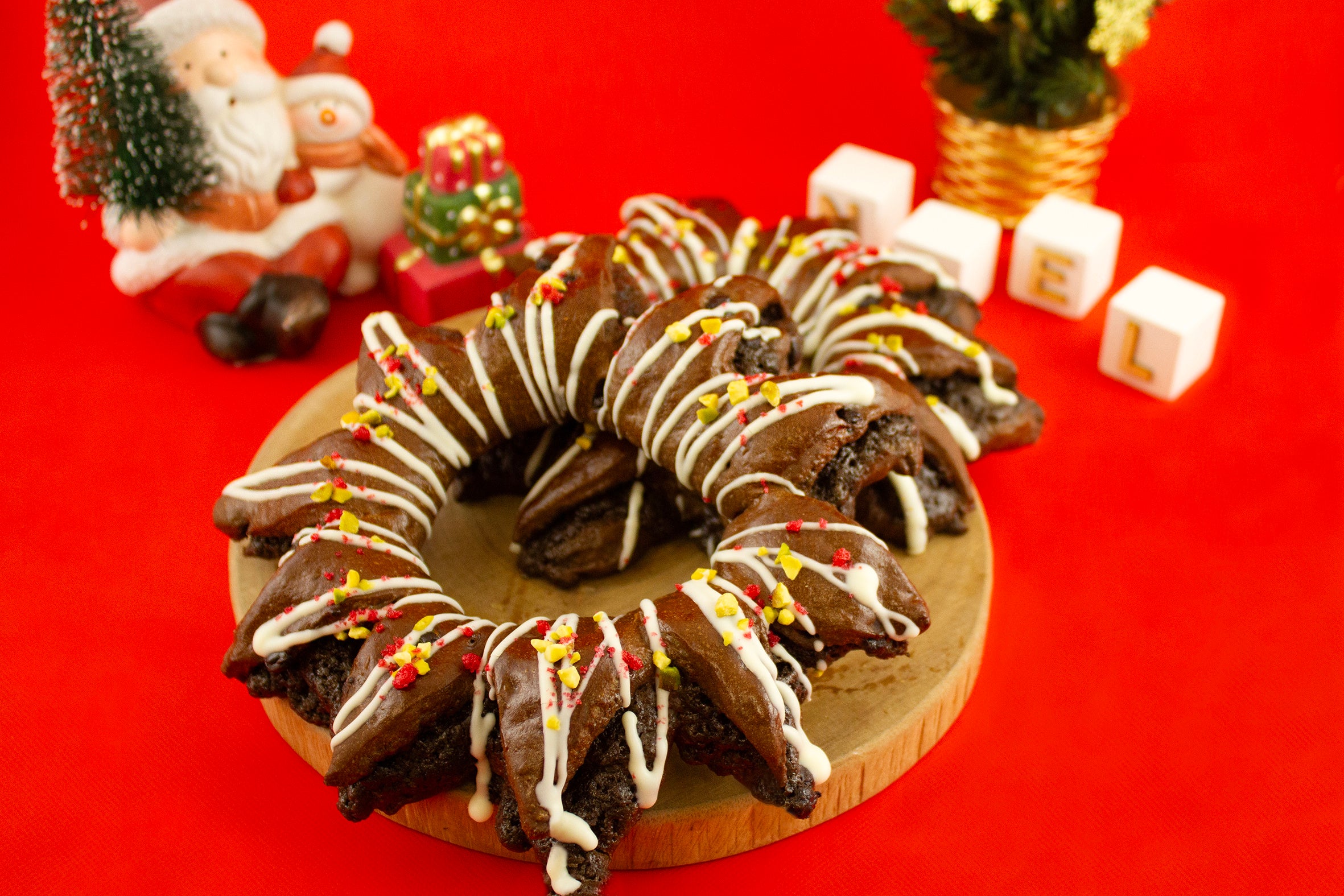 チョコチップ入りの生地にココアクッキー生地を包み焼き上げ、クリスマスリース風に見立てました。クリスマス気分を高めてくれるようなカラフルな見た目が印象的です。