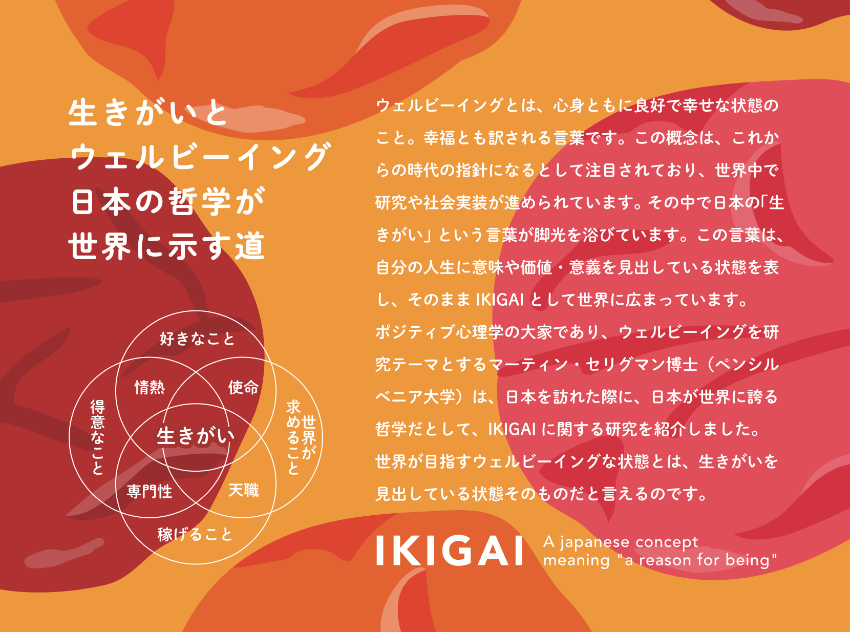 ウェルビーイングとは、心身ともに良好で幸せな状態のこと。幸福とも訳される言葉です。この概念は、これからの時代の指針になるとして注目されており、世界中で研究や社会実装が進められています。その中で日本の「生きがい」という言葉が脚光を浴びています。この言葉は、自分の人生に意味や価値・意義を見出している状態を表し、そのままIKIGAIとして世界に広まっています。ポジティブ心理学の大家であり、ウェルビーイングを研究テーマとするマーティン・セリグマン博士(ペンシルベニア大学)は、日本を訪れた際に、日本が世界に誇る哲学だとして、IKIGAIに関する研究を紹介しました。世界が目指すウェルビーイングな状態とは、生きがいを見出している状態そのものだと言えるのです。