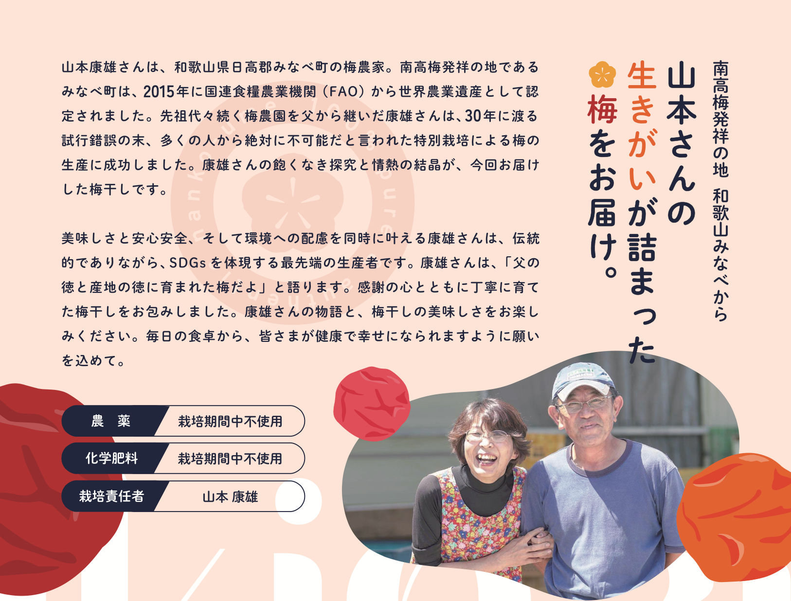 山本康雄さんは、和歌山県日高郡みなべ町の梅農家。南高梅発祥の地であるみなべ町は、2015年に国連食糧農業機関(FAO)から世界農業遺産として認定されました。先祖代々続く梅農園を父から継いだ康雄さんは、30年に渡る試行錯誤の末、多くの人から絶対に不可能だと言われた特別栽培による梅の生産に成功しました。康雄さんの飽くなき探究と情熱の結晶が、今回お届けした梅干しです。
