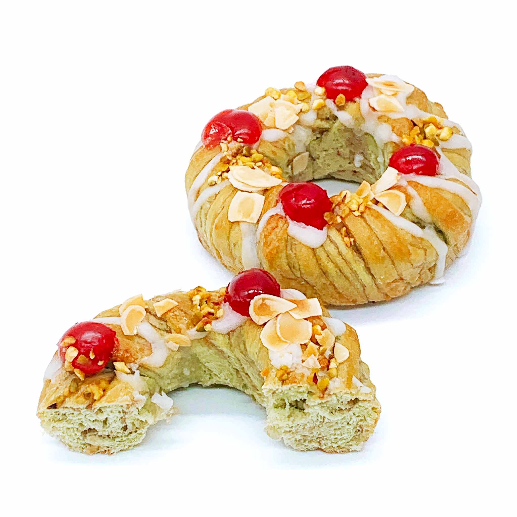 常緑樹をイメージしたピスタチオ風味のパンにチェリー、アーモンド、ピスタチオを飾った