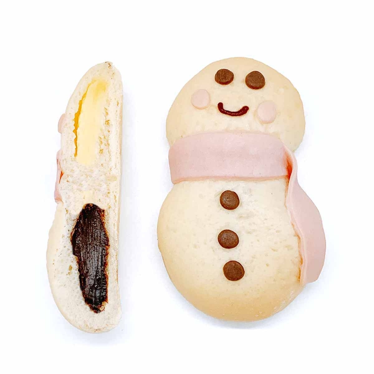 あたまにカスタードクリーム、おなかにチョコクリームを包んだ雪だるまのパンです。