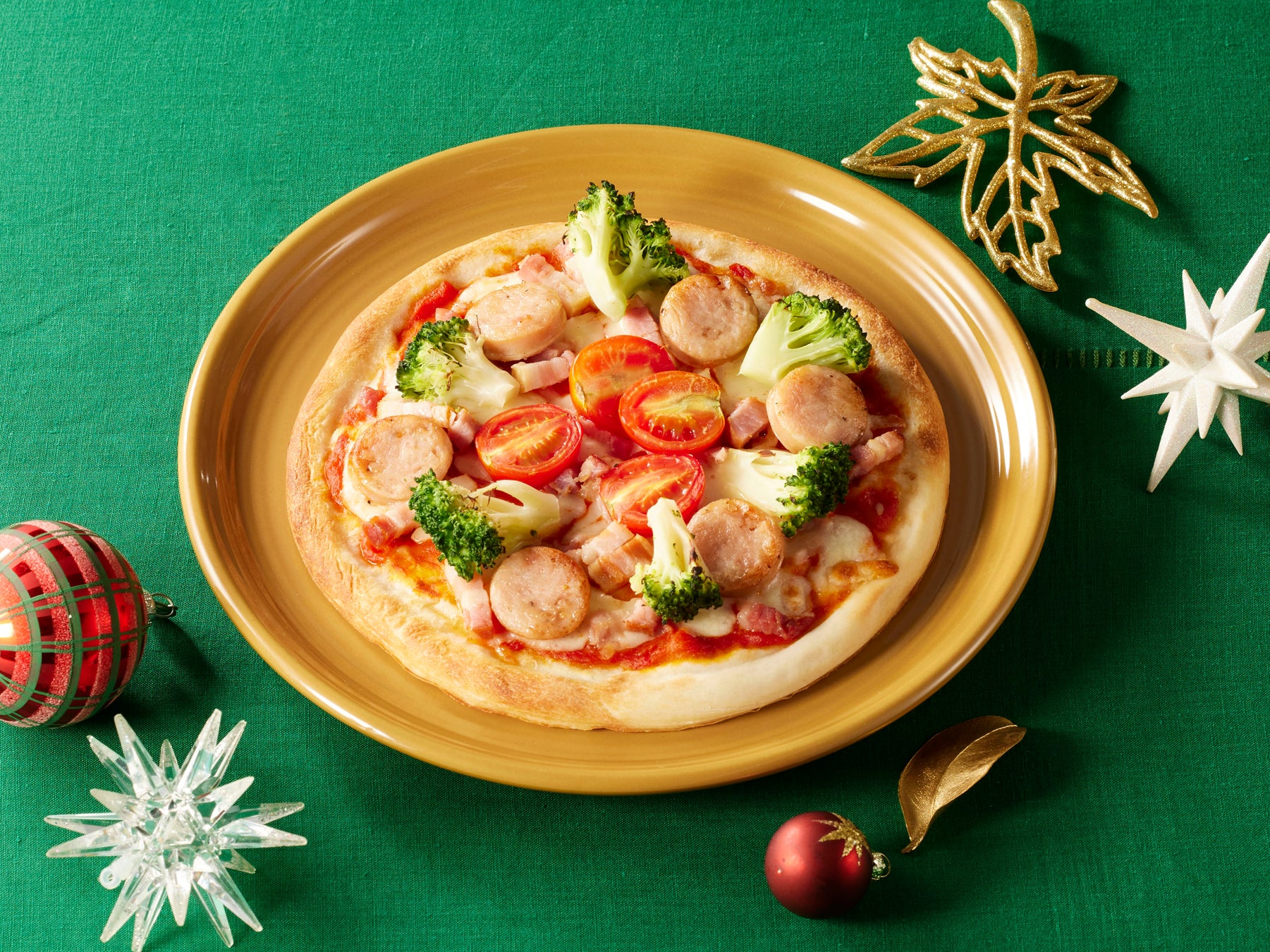 ミニトマトやピザソースの赤、ブロッコリーの緑が彩り豊かな、クリスマスカラーのピッツァです。香ばしいソーセージやベーコンもトッピングし、子どもから大人まで誰もが楽しめる、やみつきになる味わいの一品に仕上げました。具沢山で食べ応え抜群のピッツァが、クリスマスのお食事を盛り上げます。