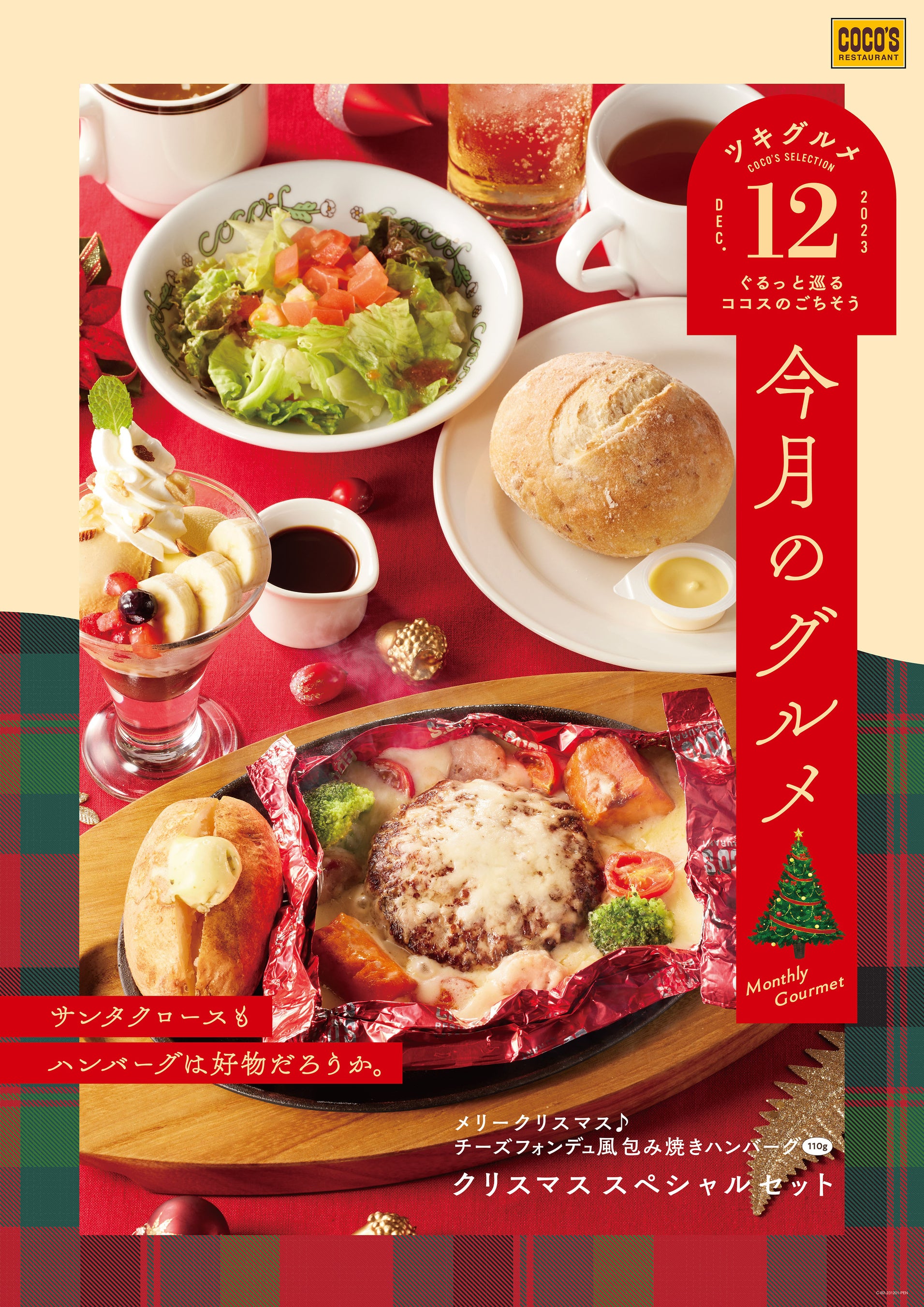 ココスでクリスマスのひとときを楽しく過ごしていただけるよう、12月限定の「クリスマススペシャルセット」をご用意しました。濃厚でクリーミーなソースがかかった熱々ハンバーグが冬にぴったりの「メリークリスマス♪チーズフォンデュ風包み焼きハンバーグ」をメインに、石窯パンまたはライス、ドリンクバー・スープバー、ミニサラダ、選べるデザートを組み合わせたスペシャルセットで、クリスマスのワクワク感をお楽しみください。