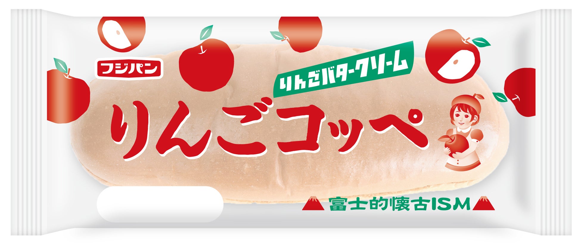 パッケージにはりんごのイラストをちりばめ、うっすらと透けるコッペパンが白を基調としたパッケージから覗きます。フジパンN0.1菓子パンの「黒コッペ」との対比を考えたデザインに仕上げています。