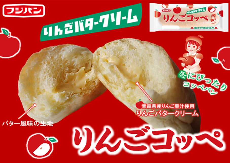 「りんごコッペ」のテーマはスイーツ感覚で食べられるコッペパン。スイーツを連想させるコッペパンにする為に、コッペパン生地はふんわりとした食感にこだわり、さらにバター風味に焼き上げました。りんごバタークリームには、青森県産りんご果汁を使用し、りんごの味わいにもこだわりました。