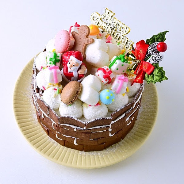 中からお菓子が飛び出してくるギミックケーキのクリスマスバージョン。煙突モチーフのケーキにはサンタさんやプレゼントがたくさん乗っていてとてもにぎやかです。見た目も可愛くクリスマスの食卓を飾るにはもってこいのクリスマスケーキ。