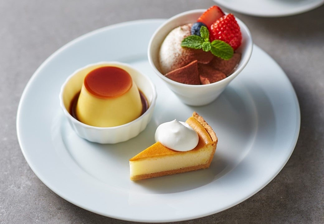 チョコレートムースとミルキークリームで仕立てたミニパフェ、カスタードプリン(ミニ)、デンマーククリーム