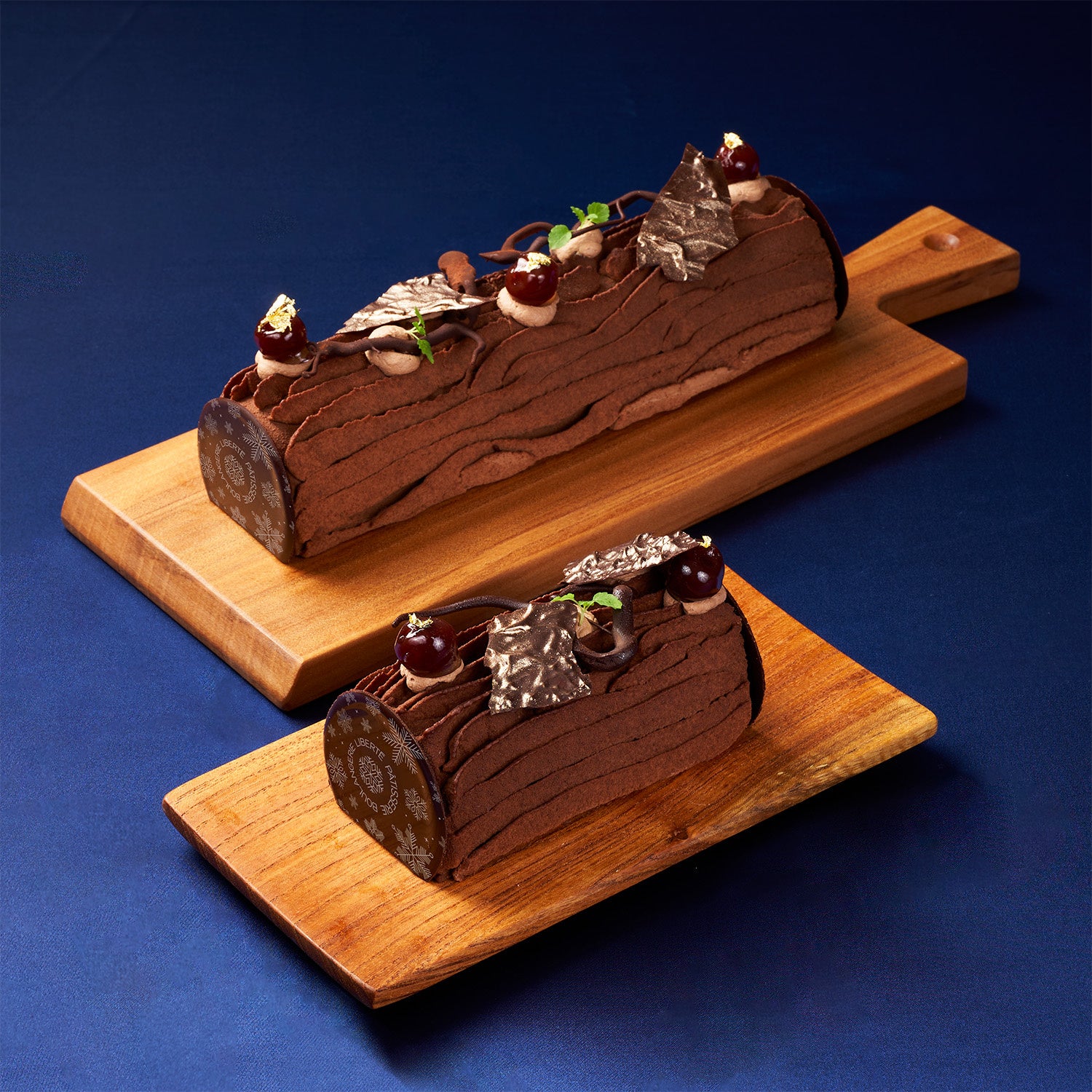 チェリーとショコラを組み合わせたフランス伝統菓子「フォレノワール」をベースにした「ブッシュ ド ノエル」。フランス高級ショコラブランド<カカオバリー>、日本生まれのショコラブランド<minimal(ミニマル)>のチョコレート4種を、ムースに、クリームに、アクセントに、とバラエティ豊かに仕上げています。チョコレート好きにはたまらないクリスマスケーキ。