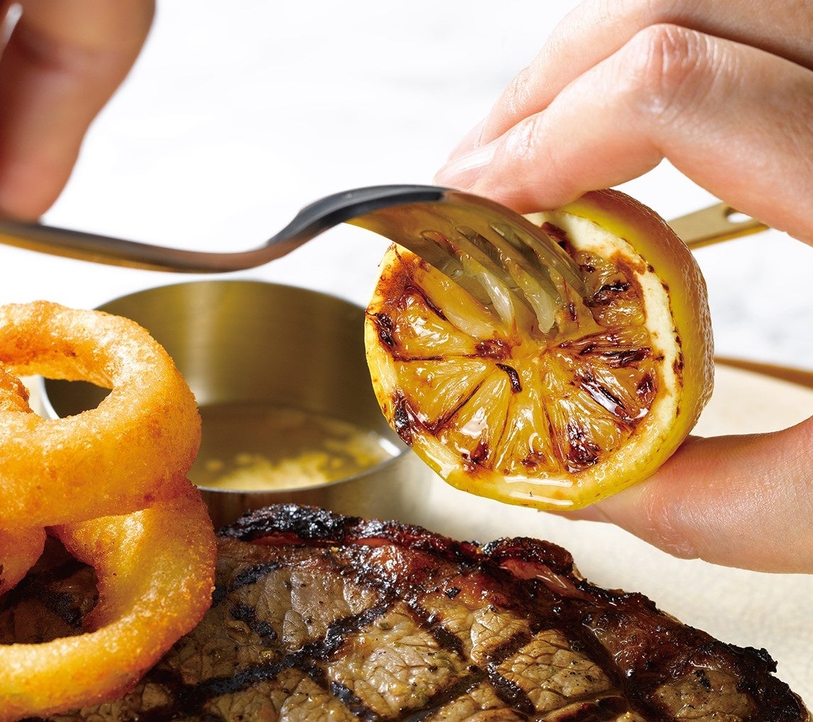 焼き目をつけたレモンは程よい酸味で、ジューシーなステーキの味わいにぴったりです。