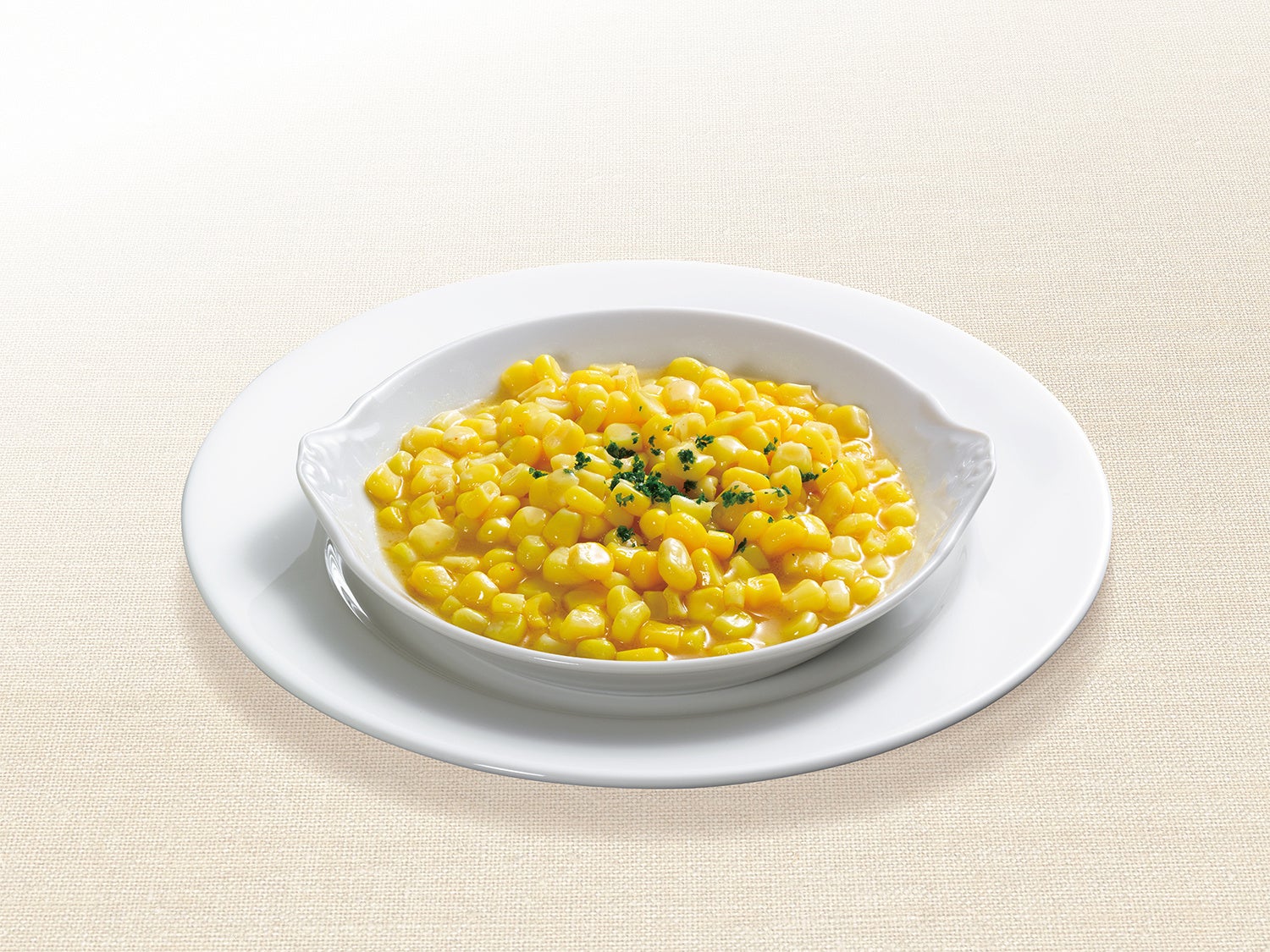コーンの甘みとバターの香り、カイエンペッパーの少しピリッとした辛味がクセになる味わい。味のベースにはチキンブイヨン、バター、生クリームを使い、ステーキの力強さに負けない味わいになっています。