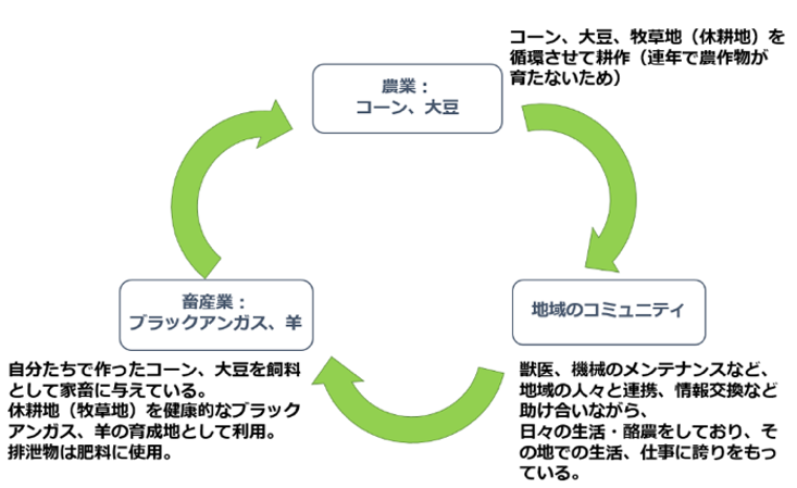 収穫後廃棄されていた農作物の一部を家畜のえさとして使用し、さらに家畜の堆肥を利用し農作物を育てるといった、資源を無駄なく循環させながら農畜産物を生産する環境に配慮した持続性のある仕組みです。