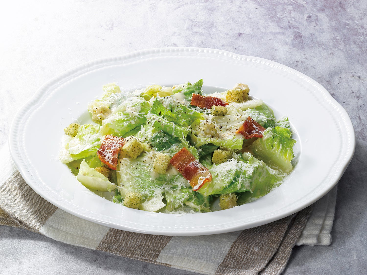 ロメインレタス、パルミジャーノレジャーノチーズ、クルトンをシーザードレッシングで和え、カリっと焼いたベーコンをのせ、更にパルミジャーノレッジャーノチーズをかけて仕上げます。ロメインレタスの葉は厚みがあり、濃厚なチーズの味わいにもよく合います。